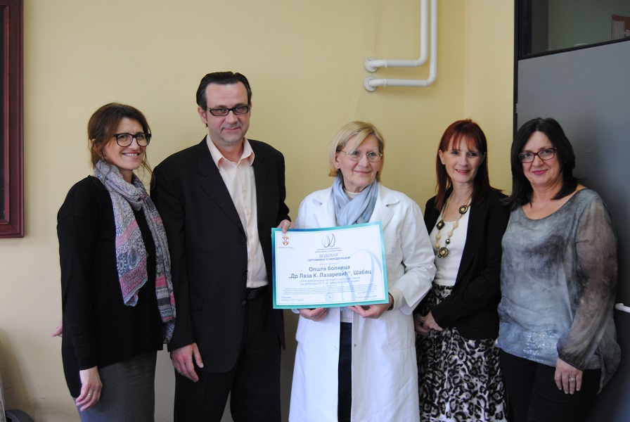 Дана 4. априла 2017. године директор ÐЗУС-а Владимир ÐÑ€Ñеновић и виши Ñтручни Ñарадник Светлана Дрча Ñвечано Ñу уручили директорки Опште болнице Шабац др Зори Ðиколић Сертификат о Ñтеченој акредитацији на период од 7 година.